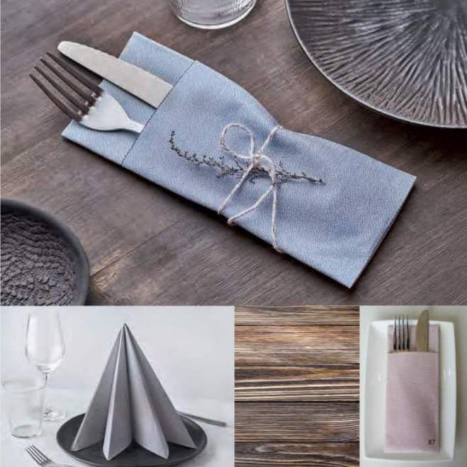 El Tissue Seco es un producto de la familia de los no-tejidos. Por su apariencia y textura consigue dar un toque elegante a la vez que informal a la mesa. Tiene un gramaje de 55 gr/m² y forma parte de las servilletas compostables y biodegradables Air Laid Bio de La Pajarita. Este producto nos permite tener una amplia gama de colores, dándonos la posibilidad crear multitud de combinaciones y adecuarlo a la decoración del local.